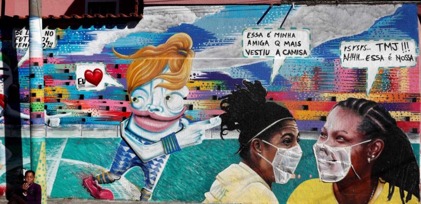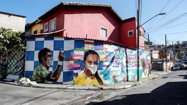Rodrigo Rodrigues, grafitero de Brasilandia uno de los barrios más pobres de Sao Pablo realizó grafitis con tapabocas para concienciar a la población. Esta ciudad lidera la lista con más decesos en Brasil a causa del coronavirus.
