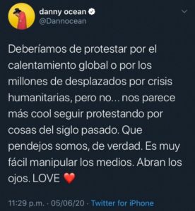 Daniel Alejandro Morales Reyes, mejor conocido como Danny Ocean, intérprete de grandes éxitos como “me rehúso” o “dembow”, quiso al igual que otros famosos opinar al respecto de las protestas raciales en Estados Unidos, ahora conocidas como Black Lives Matter, calificó como “pendejos” a los individuos que se dedican a protestar por “cosas del siglo pasado”.