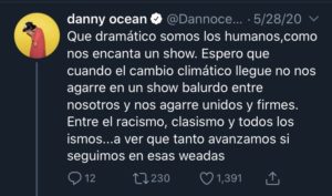 Más tarde, Ocean argumentó que los internautas crearon un gran drama respecto a su comentario y contó su anhelo de que “cuando el cambio climático llegue no nos agarre en un show tan balurdo entre nosotros y nos agarre unidos y firmes”