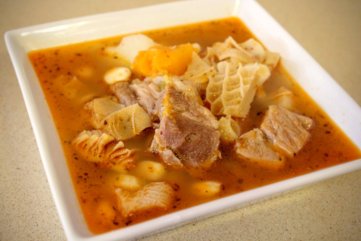 Especie de sopa elaborada con cabeza, tripas y espinazo de chivo cocido todo con legumbres, verduras y especias.