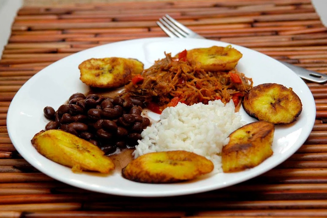 Un platillo nacido en los llanos venezolanos es el chiguire mechado acompañado de caraotas y arroz.