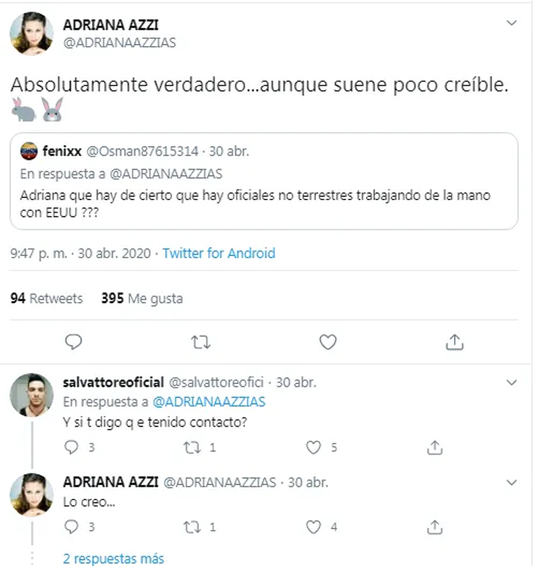 El pasado jueves 30 de abril, un usuario de Twitter le preguntó si ella tenía conocimiento sobre unos supuestos “oficiales no terrestres” que se encuentran “trabajando de la mano con EE.UU”.