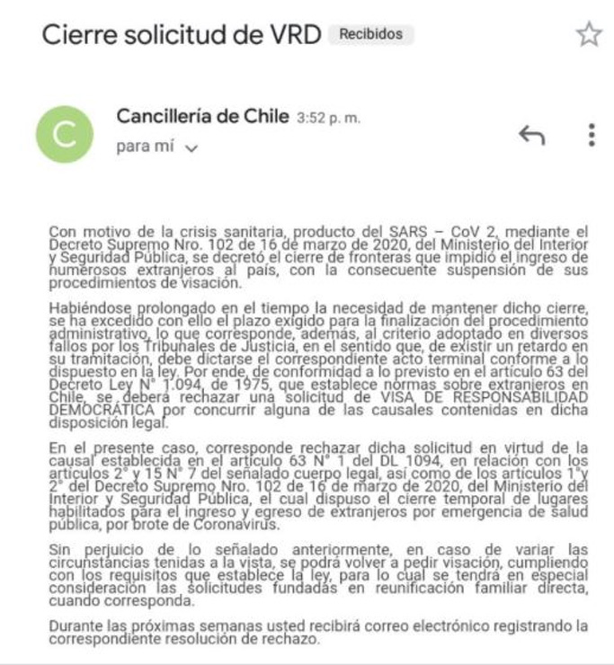 La información se pudo conocer por varias personas que aseguraron que les llegó un correo electrónico proveniente de la cancillería de Chile, donde se les notificaba la decisión que el gobierno había tomado.