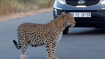 ¡Que tierno! Una Leoparda pastorea a sus cachorros en la carretera